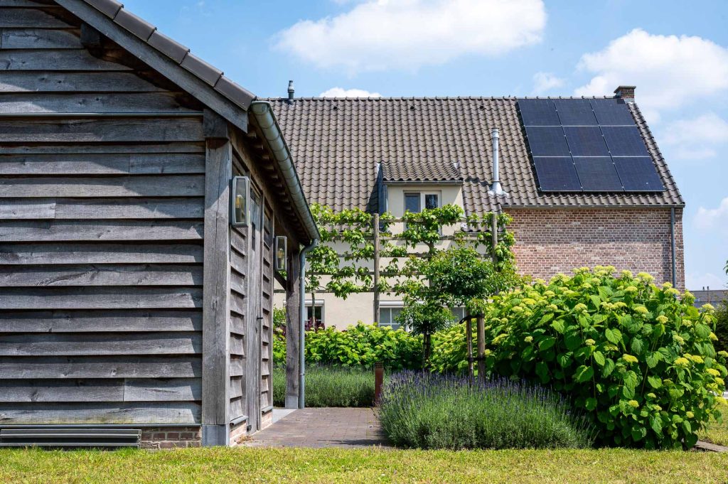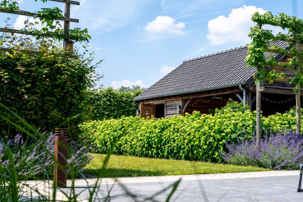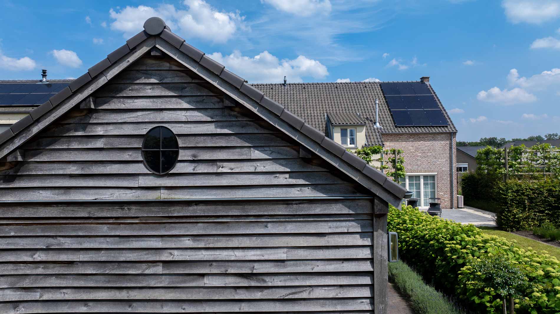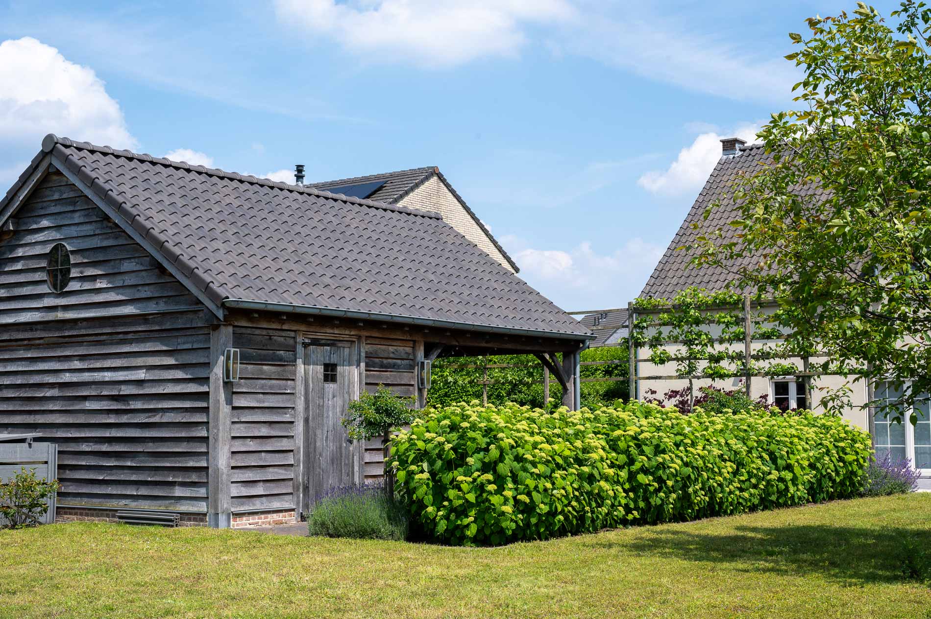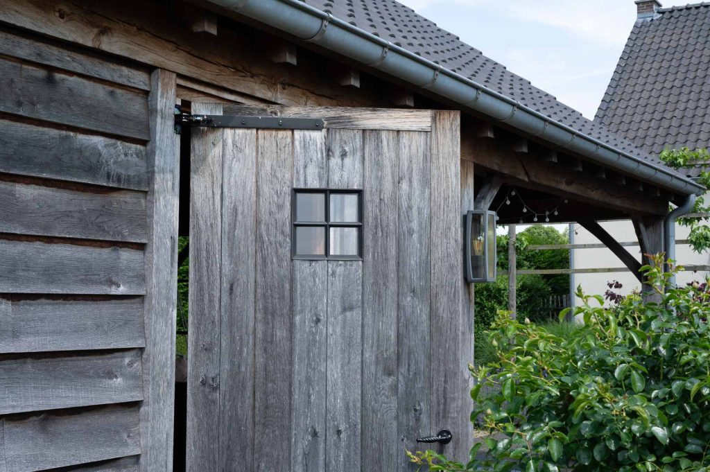 Het bijgebouw heeft een ruime opzet en biedt alle mogelijkheden om tot rust te komen of samen te zijn. De gevelbekleding, met zijn warme en natuurlijke uitstraling, draagt bij aan de rustieke charme. De houtsoort vergrijst op een subtiele manier en laat het bijgebouw naadloos opgaan in het landschap, alsof het er altijd al stond.